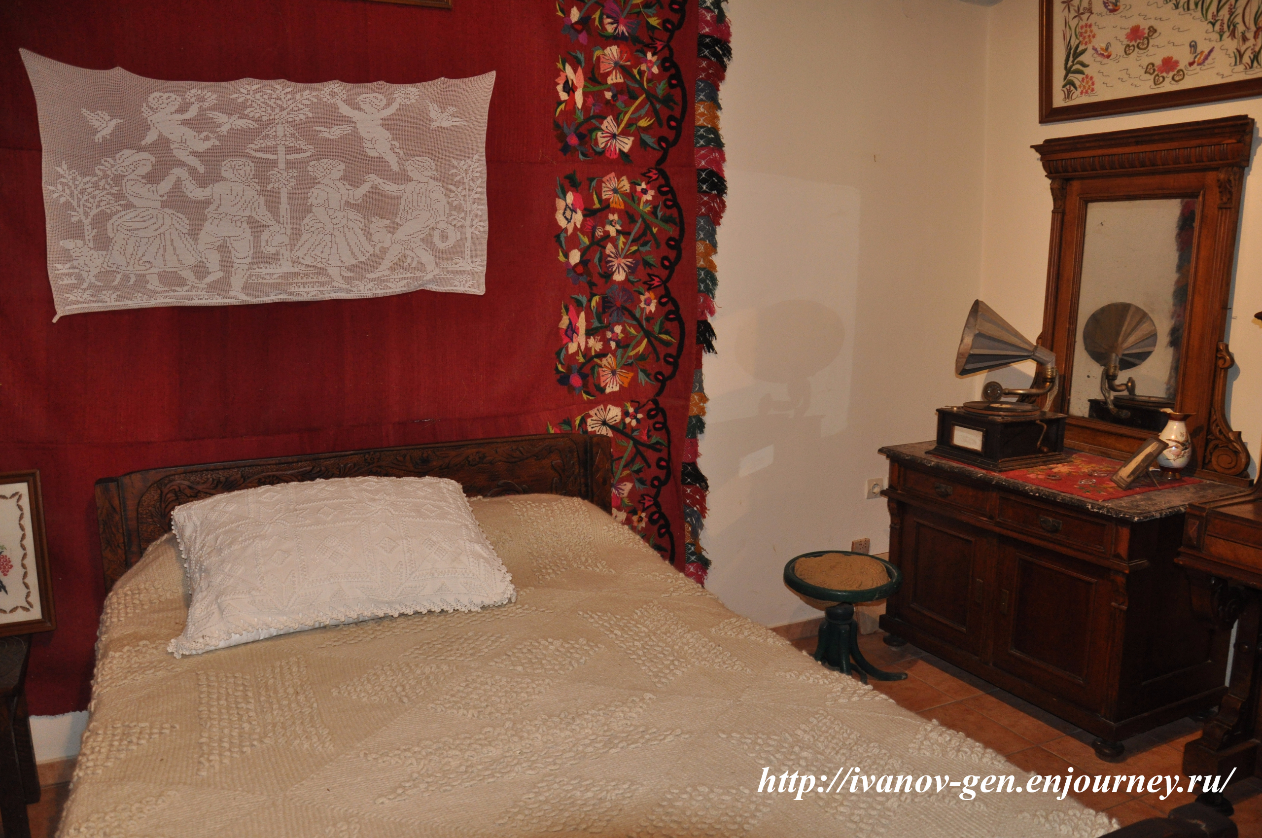 выделенный угол для молодых, вытканное одеяло, вышитая наволочка на подушке, ткань на стене могло быть частью собственноручно изготовленного приданого молодой жены или собственноручно сделаны дочерью-невестой.