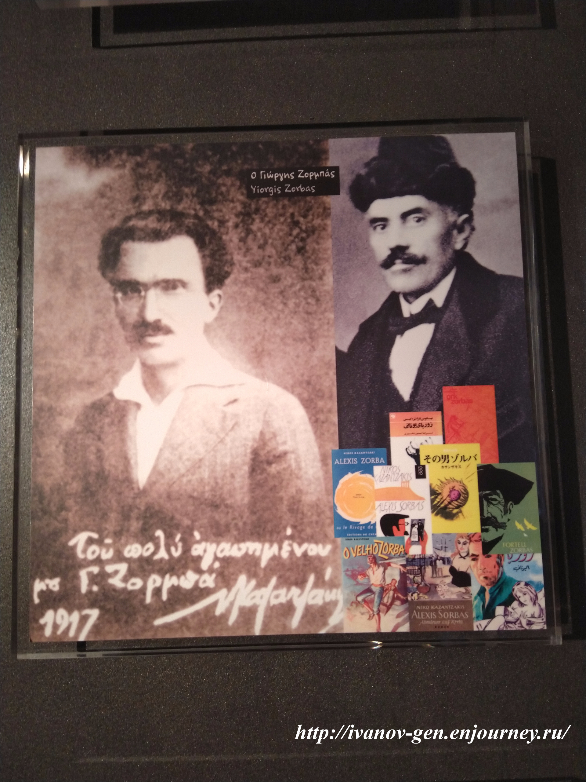фотография реально жившего Алексиса Зорбаса — друга Казандзакиса, ставшего прототипом романа Грек Зорба. Самое интересное, что реально живший Алексис Зорбас в отличие от героя романа Казандзакиса никогда не был на Крите и никогда не занимался лесозаготовками, а угледобычей занимался на Пелопоннесе (на Крите вообще нет залежей угля)