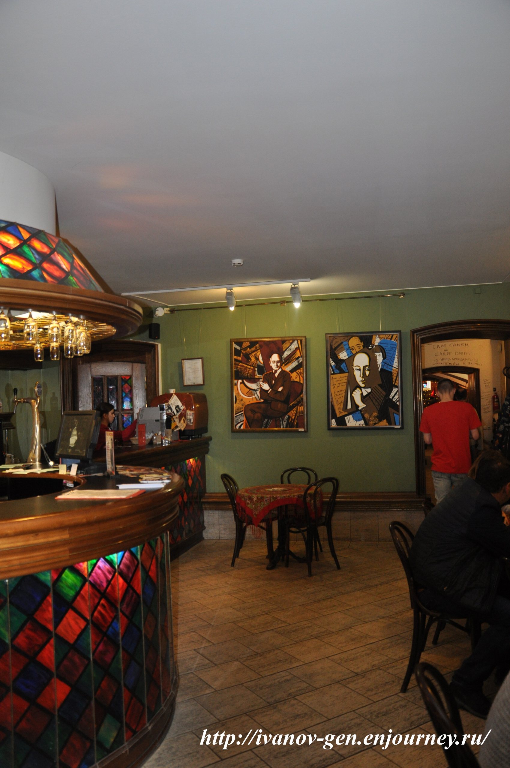 Интерьер «Подвала бродячей собаки» — на стенах рисунки про известных завсегдатаев кафе — поэтов. художников и прочей богемы