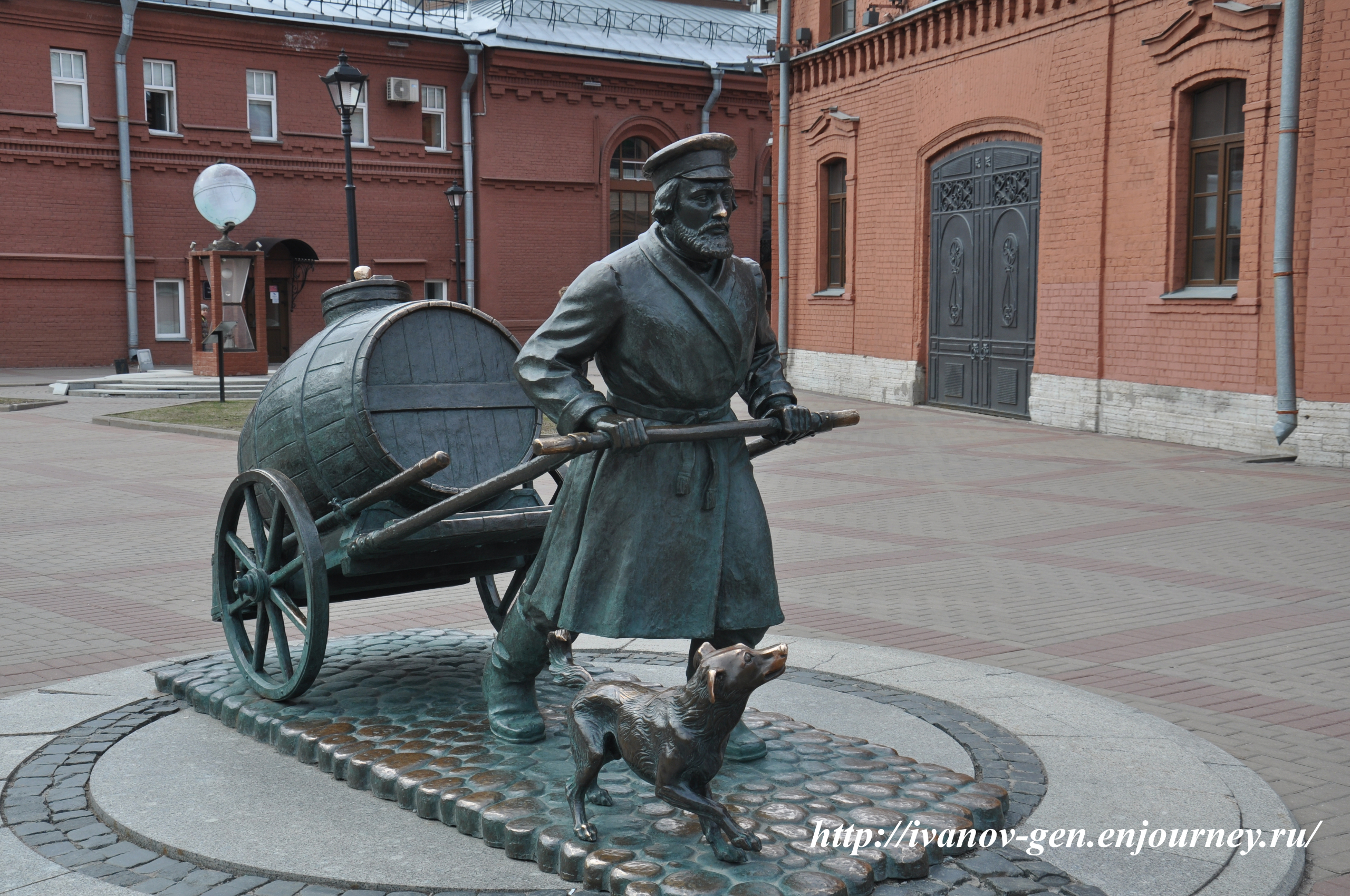 И здесь же памятник водовозу. самое интересное, что этот водовоз — штрафник. Обычно в упряжку запрягали лошадь и возили водовозы различную воду — из Невы, из Фонтанки, из Мойки и отличалась вода по степени чистоты, например вода из Невы считалась самой чистой и шла для питья. Воду возили в бочках разного цвета. Но иногда водовозы халтурили — например пытались продать воду из Фонтанки по цене воды из Невы. Этого халтурщика уличили в обмане и отняли у него лошадь. Вот и приходится ему самому везти воду.